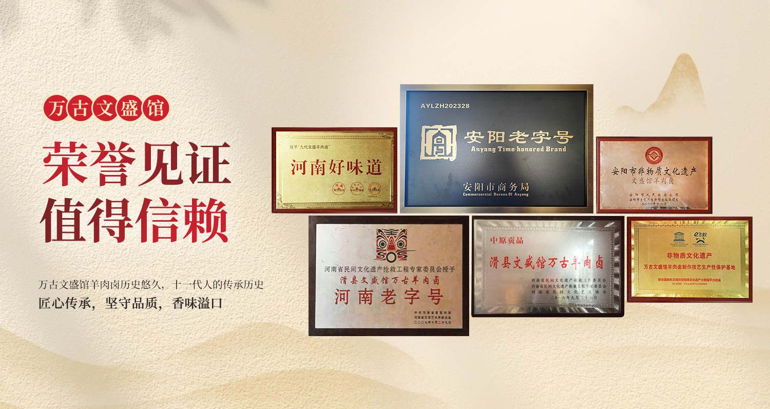 萬(wàn)古文盛館羊肉鹵從始至今,始終堅(jiān)持“每代傳一門,傳男不傳女,傳內(nèi)不傳外”的祖規(guī)。在傳承過(guò)程中,很多有關(guān)典籍已失于戰(zhàn)亂和水患。主要收集的傳承譜系和有關(guān)記載如下:  第 一代:王家孝(1654-1733)萬(wàn)古文盛館羊肉鹵創(chuàng)始人;  第 二代:王憲文(1678-1758);  第 三代:王全仁(1710-1788);  第 四代:王元相(1748-1830);  第 五代:王克敬(1778-1869);  第 六代:王心欽(1807-1887);  第 七代:王光玉(1839-1921);  第 八代:王發(fā)喜(1869-1919);  第 九代:王文聚(1905-1981);王文聚在當(dāng)?shù)厝司墭O好。他在梁村集長(zhǎng)期經(jīng)營(yíng)飯館,經(jīng)濟(jì)條件比一般人較好,常常資助貧弱者。中華人民共和國(guó)成立之初,為了響應(yīng)國(guó)家的號(hào)召,并把正在經(jīng)營(yíng)的文盛館全部資產(chǎn),融入萬(wàn)古合作社,將原梁村文盛館店址搬遷到萬(wàn)古集經(jīng)營(yíng)。成為了供銷社的正式職工,擔(dān)任羊肉鹵制作技師,一直工作到退休,他制作羊肉鹵的技術(shù)非常高超,味道鮮美獨(dú)特,把畢生精力全部用在羊肉鹵的研發(fā)、創(chuàng)新、傳承上,因萬(wàn)古玉皇閣(全國(guó)四大名閣之一)廟會(huì)影響周邊數(shù)百公里,每天食客絡(luò)繹不絕,皆以吃上王文聚親手制作的羊肉面為榮,影響巨大。  第十代:王守真(1944-2009);改革開(kāi)放初期,受聘于滑縣飲食服務(wù)公司,先后在順河街回民食堂、國(guó)營(yíng)旅社回民飯店工作,專門從事羊肉鹵的制作經(jīng)營(yíng)和技術(shù)傳授。王守真善于鉆研,并不斷創(chuàng)新,使萬(wàn)古文盛館羊肉鹵的品質(zhì)得到又一次飛躍。  王洪標(biāo)、第十一代傳人,王洪標(biāo)2010年被河南省人民政府授予省級(jí)萬(wàn)古文盛館羊肉鹵制作技藝傳承人。王洪標(biāo)在繼承前十幾代藝人傳統(tǒng)技藝的基礎(chǔ)上,大膽探索、潛心鉆研、不斷創(chuàng)新,是羊肉鹵的味道更加鮮美,醇香四溢,正如坊間盛傳“食一口而動(dòng)全身,讓人回味無(wú)窮之妙”,以及“東西南北都吃遍,不如文盛館羊肉面,喝一碗文盛館羊肉湯,一年四季想得慌”,可見(jiàn)其味道堪稱珍饈美饌。王洪標(biāo)開(kāi)展手工技藝和傳統(tǒng)文化的廣泛傳播,大力培養(yǎng)技術(shù)人才。建設(shè)規(guī)模性養(yǎng)殖園,對(duì)每只羊從喂養(yǎng)到餐桌整個(gè)鏈條,實(shí)行身份證識(shí)別制度,建立綠色環(huán)保經(jīng)營(yíng)模式,面向全國(guó)開(kāi)展連鎖加盟經(jīng)營(yíng),讓更多人吃上放心肉和傳統(tǒng)的美味佳肴而努力。  2007年;河南省文聯(lián)、河南省委宣傳部授予“河南老字號(hào)”稱號(hào);  2009年6月,被河南省人民政府、河南省文化廳列入“河南省非物質(zhì)文化遺產(chǎn)”保護(hù)名錄;  2010年,被安陽(yáng)市人民政府列入“安陽(yáng)市非物質(zhì)文化遺產(chǎn)”保護(hù)名錄;  2016年6月,被河南大河報(bào)、河南餐飲與飯店行業(yè)協(xié)會(huì)評(píng)為“河南好味道”;  2016年9月被河南省民間文化遺產(chǎn)搶救工程工作委員會(huì)、河南省民間文化遺產(chǎn)搶救工程專家委員會(huì)、河南省民間文藝家協(xié)會(huì)授予“中原貢品”稱號(hào);  2017年被錄入聯(lián)合國(guó)教科文組織非物質(zhì)文化遺產(chǎn)大數(shù)據(jù)平臺(tái),文盛館羊肉鹵制作技藝生產(chǎn)性保護(hù)基地  2020年授予:中華老字號(hào)  2021年4月授予:安陽(yáng)美味  2023年授予商務(wù)局:“安陽(yáng)老字號(hào)”中 央電視臺(tái)CCTV7“鄉(xiāng)土”、中 央電視臺(tái)CCTV7“鄉(xiāng)愁”河南省電視臺(tái)“老家的味道”、CCTV17套“”誰(shuí)知盤中餐”CCTV央視2套、河南省電視臺(tái)“香香美食”、河南省電視臺(tái)“老家的味道”滑縣電視臺(tái)、“傳奇滑州”等各大媒體采訪宣傳報(bào)道。  “文盛館”羊肉鹵,展示了中原飲食,文化的博大精深,展示了民間傳統(tǒng)手工技藝的獨(dú)特。為積極宣傳中原傳統(tǒng)飲食文化起到了無(wú)可代替的推動(dòng)作用。