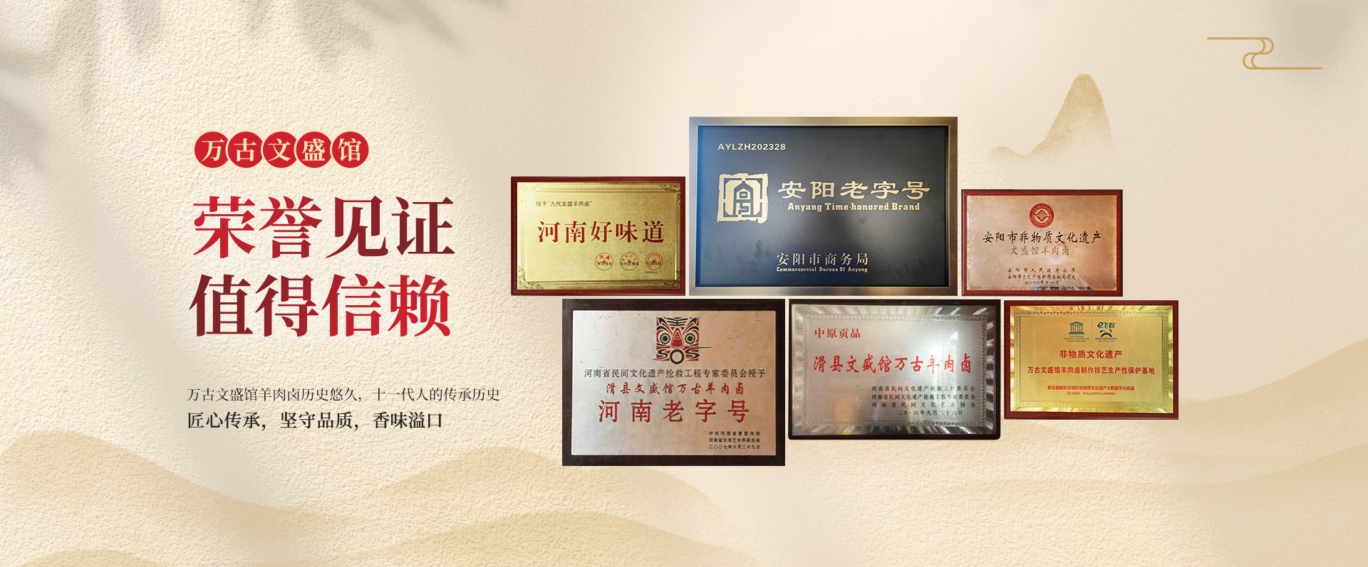 萬(wàn)古文盛館羊肉鹵,始創(chuàng)于清順治二年(1645年),發(fā)源于滑縣萬(wàn)古鎮(zhèn)梁村集,俗稱“萬(wàn)古羊肉鹵”,先后歷經(jīng)王氏家族十幾代人的傳承歷史,逐步積淀成今天的美味佳肴和獨(dú)門絕技。萬(wàn)古文盛館羊肉鹵歷史悠久,內(nèi)涵豐富,工藝復(fù)雜,風(fēng)味獨(dú)特。依靠祖 傳秘方制作,被譽(yù)為中原名饈。咸豐年間曾作為宮廷御用貢品。《滑縣志》有“東西南北都吃遍,不如萬(wàn)古羊肉面”、“隴饌有熊臘,豫烹唯羊鹵”之載述。    王氏家族先人,在“梁王城”(今萬(wàn)古鎮(zhèn)梁村集)開(kāi)飯館為生,用羊肉做鹵湯。一天,他在炸制羊油加入大料準(zhǔn)備下肉時(shí),一不小心將醋壇打翻在鍋臺(tái),陳年老醋灑入熱油鍋中,隨即油煙沸騰,異香四射,頓時(shí)繚繞在大街小巷。這種氣味令人為之一振,隨后,眾人紛紛打探味從何來(lái),并循著氣味來(lái)到了王家飯館,大家驚訝之后給以盛贊。王氏先人弄拙成巧,因失誤得法。他遂將羊肉館取名為:“聞盛館”(聞味盛贊之意)。聞盛館常有文人詩(shī)客相聚,談天說(shuō)地,詠詩(shī)作對(duì)。    一天,乾隆便裝游歷“玉皇閣”時(shí),食欲陡增,饑餓難耐,便問(wèn)及地方美食,答曰:有一“聞盛館”,常有文人詩(shī)友聚之,乾隆隨喚地方官呈至,食后大喜,贊曰:“‘聞盛館’者‘文盛館’也”(文詩(shī)墨客盛聚之意)。    從此以后,因乾隆樹名,“萬(wàn)古文盛館羊肉鹵”自然替代了“聞盛館”之名,而被喚至今。    后來(lái),王氏先人不斷用醋加以調(diào)試,并創(chuàng)新了食醋的獨(dú)特制作工序和味道,在質(zhì)量和品位方面,一次次研究總結(jié),直到自己完全滿意為止。這種佐以秘制醋的妙用,使羊肉鹵不僅去除了原有的膻、腥、膩,還使味道芬芳溢口,粘齒留香,更醇更厚——令人回味悠長(zhǎng),久久難忘。